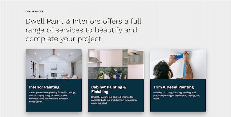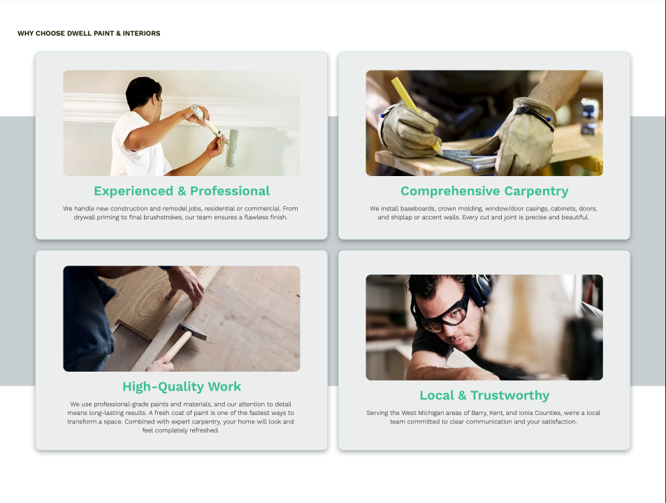 Designed and built the website for Dwell Painting & Interior, focusing on a modern, welcoming design that highlights the company’s craftsmanship and attention to detail. The site was structured for clarity, ease of navigation, and strong visual presentation of their work.
